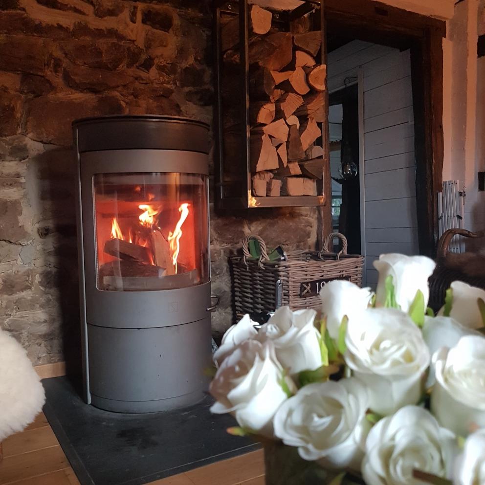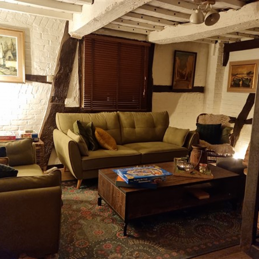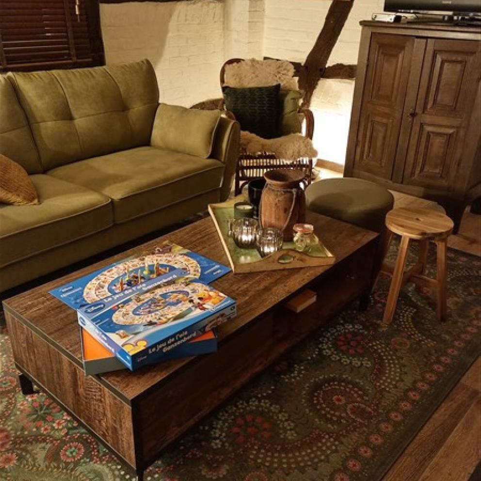 Salon (on the voute) cozy and comfortably furnished, wood stove, bar cabinet with wine glasses and cocktail glasses,… digital TV Proximus, free WiFi, various types of board games in the wicker basket,…